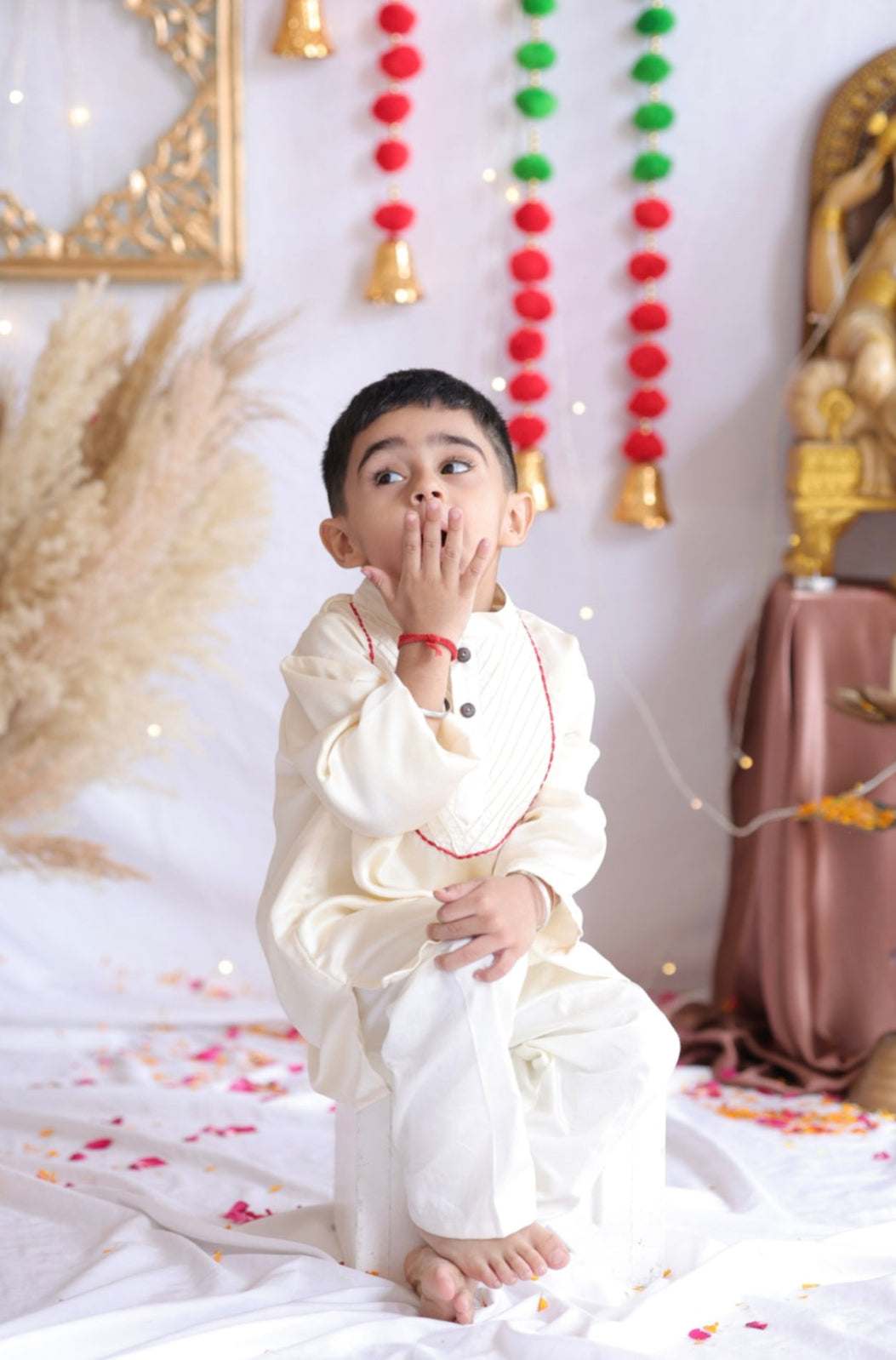 Bright, elegant, and festive – this ivory kurta set is crafted in a luxurious linen-satin blend for a soft sheen and comfortable fit. The kurta features embroidery and pleats around the neck with wooden buttons for ease of wear. Perfect for weddings, festive occasions, and joyful celebrations.