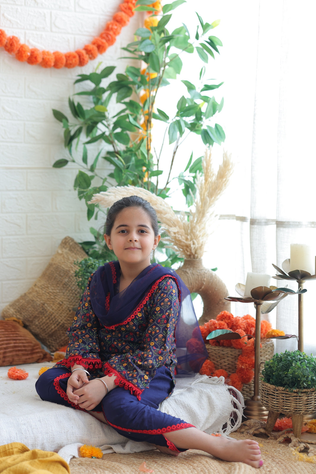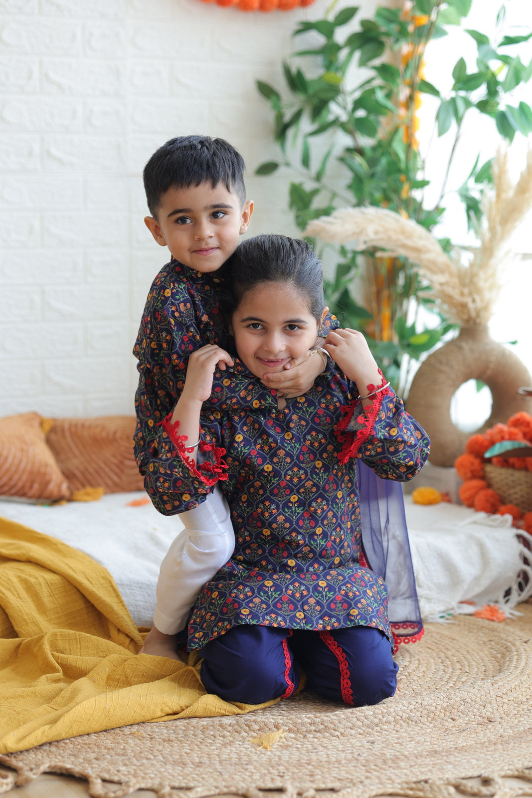Graceful and effortlessly charming, The Midnight Bloom Girl is a navy floral outfit that brings together playful design and subtle sophistication. The cotton top is detailed with lace, paired with comfortable cotton tulip pants that are perfect for a full day of celebration or a family function. Thoughtfully designed to let her move, twirl, and giggle with ease — this set is a festive must-have!
