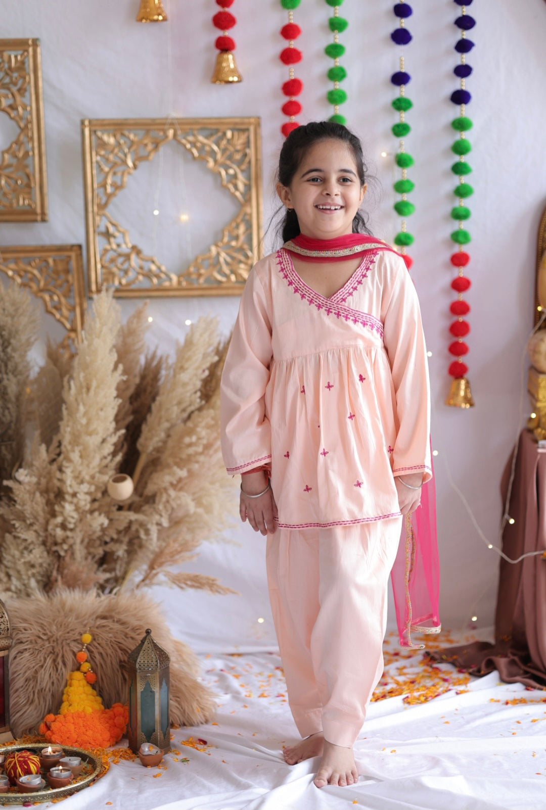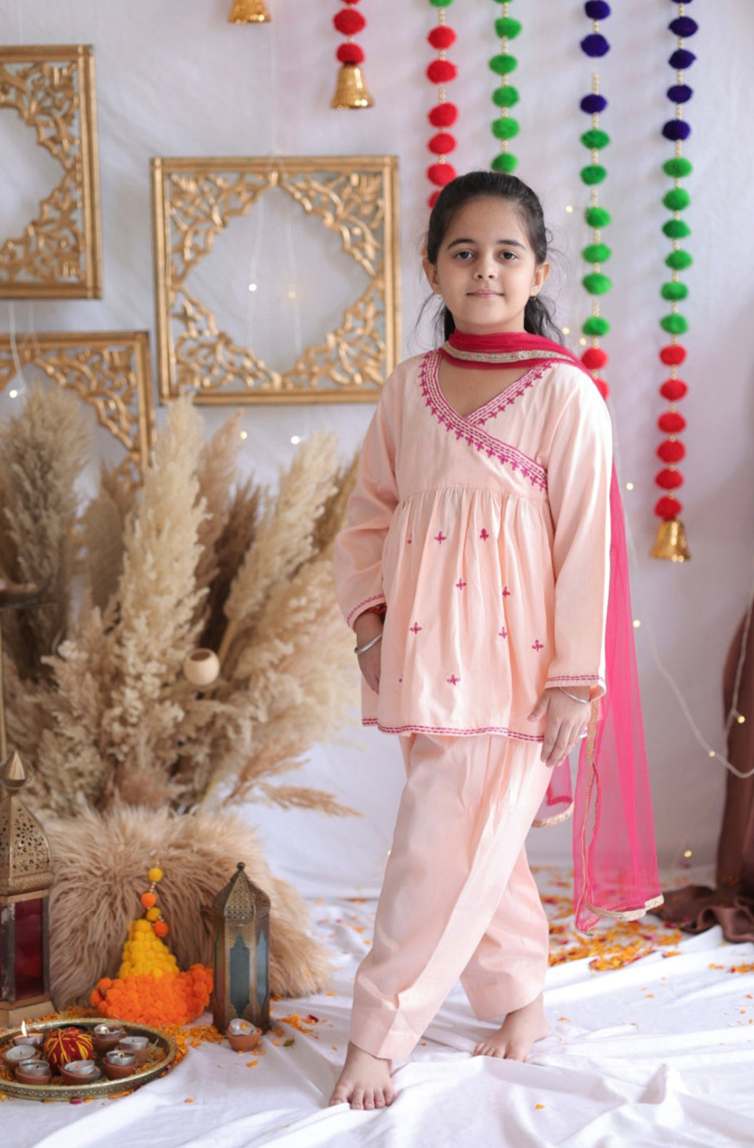 The peachy-pink kurta features a graceful Angrakha style neckline with subtle thread embroidery that continues to spread as delicate motifs over the peplum flare. The long-sleeved kurta offers a relaxed yet stylish fit and includes a back zip for easy dressing.