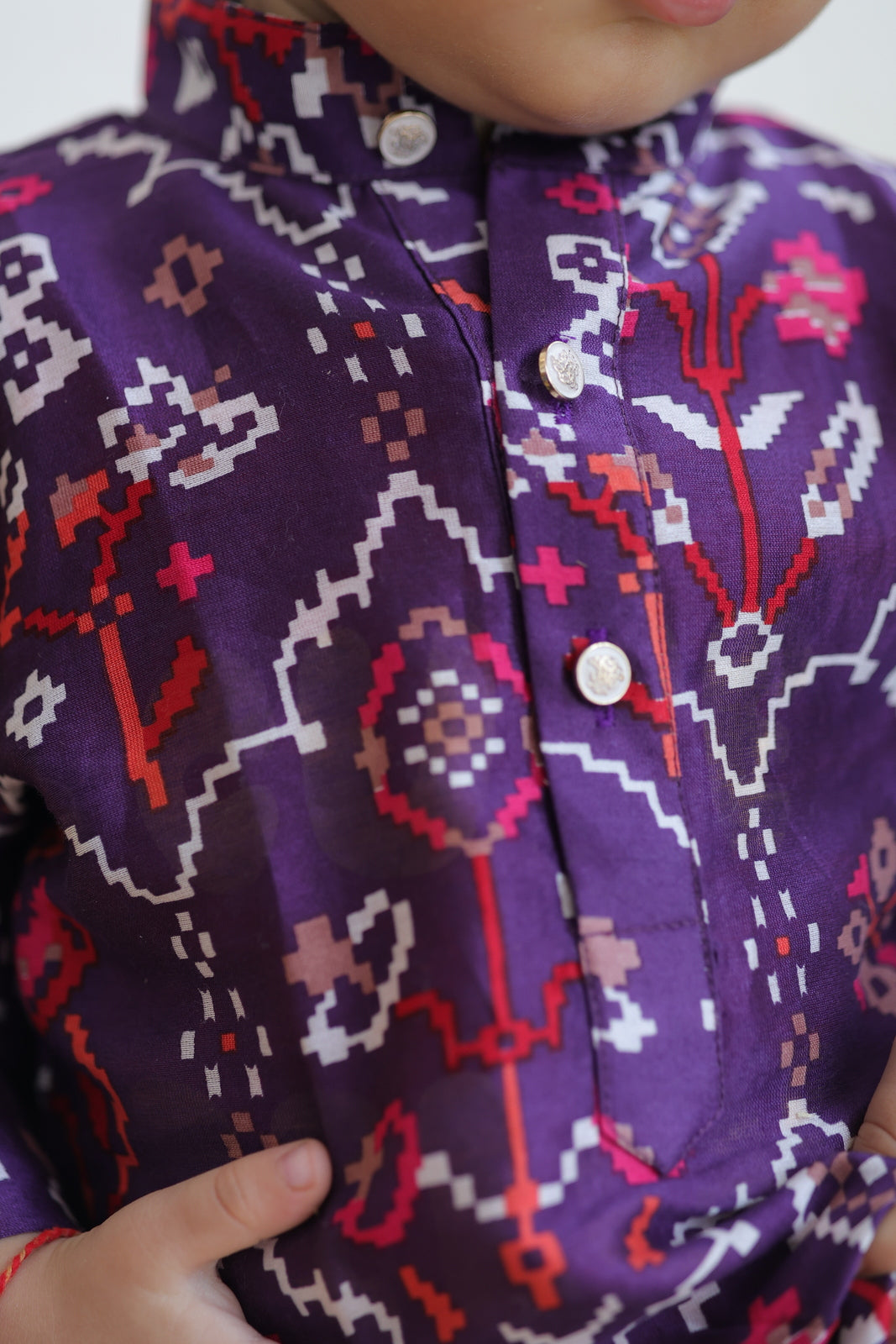 Crafted in a rich purple hue, the kurta features a sleek mandarin collar and silver-golden metal buttons down the front, paired with crisp white cotton pants for a clean festive look.