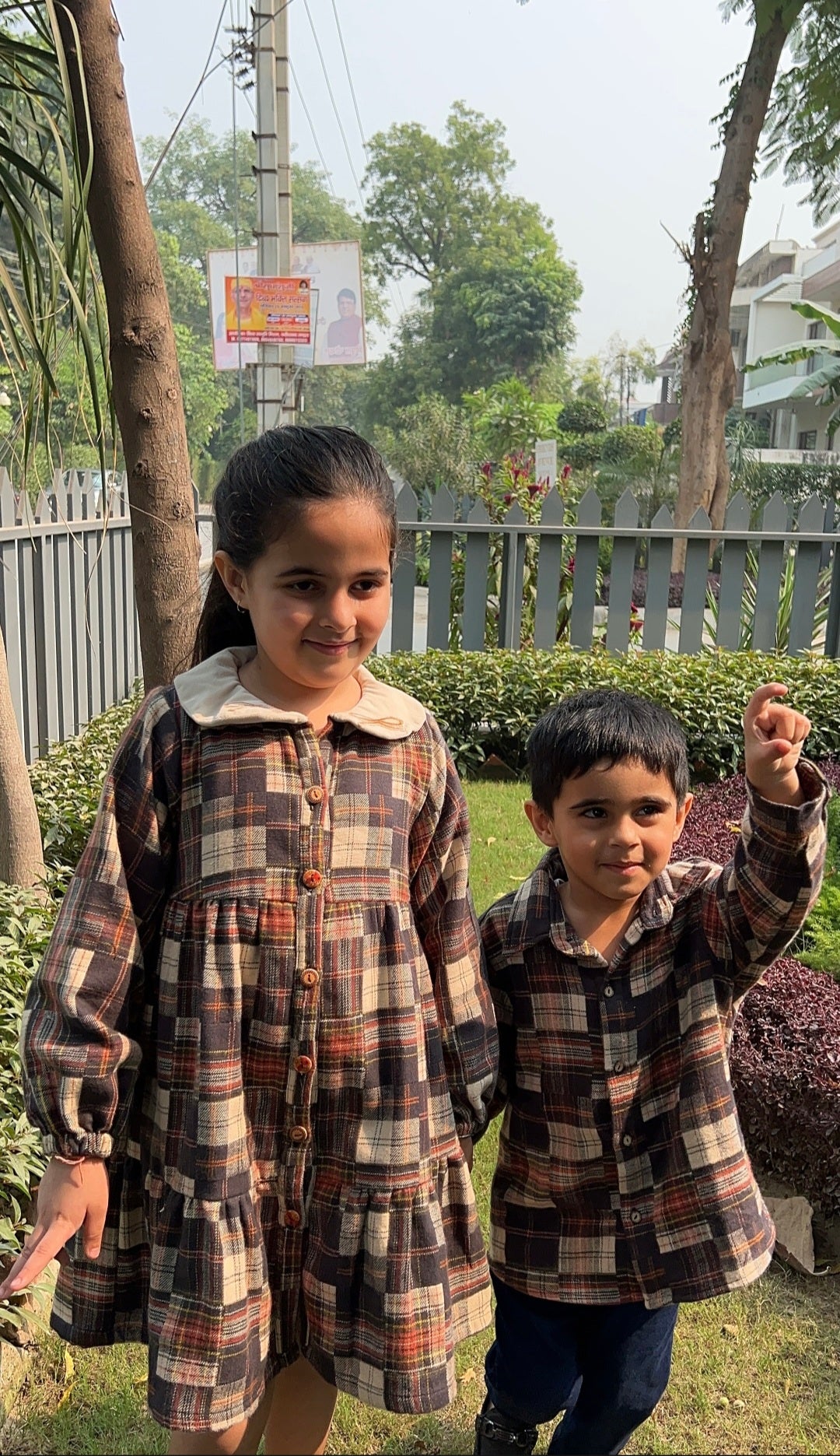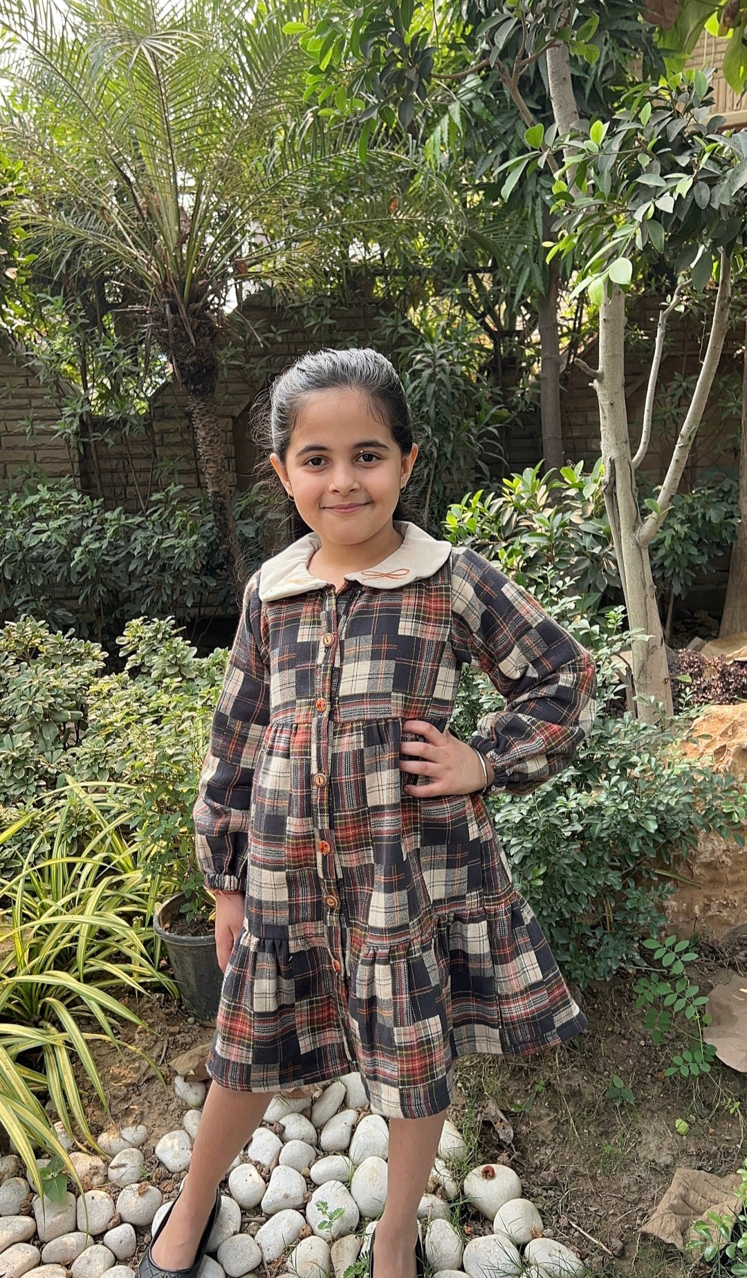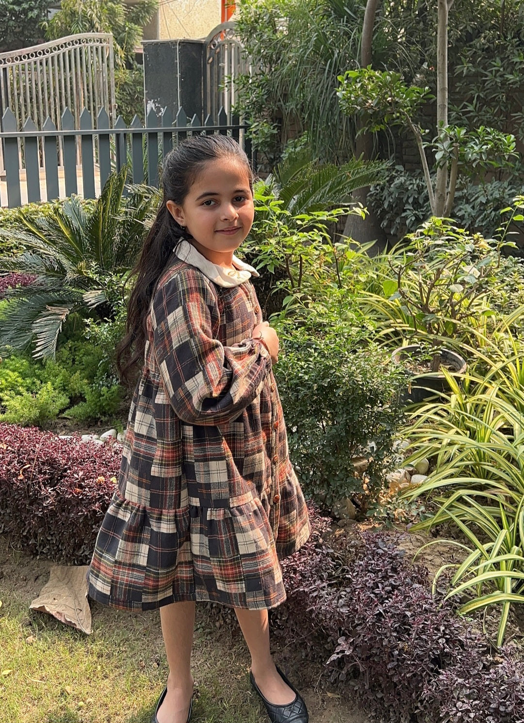 A perfect blend of comfort and charm, our Rust Charm Check Dress is crafted from 100% soft cotton to keep her cozy through the winter season. Designed with delicate double gathers for a fuller, twirl-worthy silhouette and front button opening, it brings effortless elegance to her everyday style. The contrasting collar features fine bow embroidery, adding a touch of sweetness to the classic check pattern. Gentle on the skin and beautifully detailed, this dress is ideal for winter outings, festive get-togethers, or cozy family days.