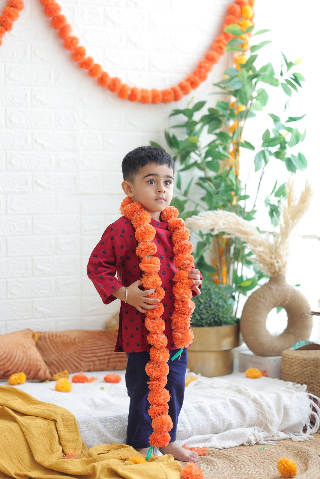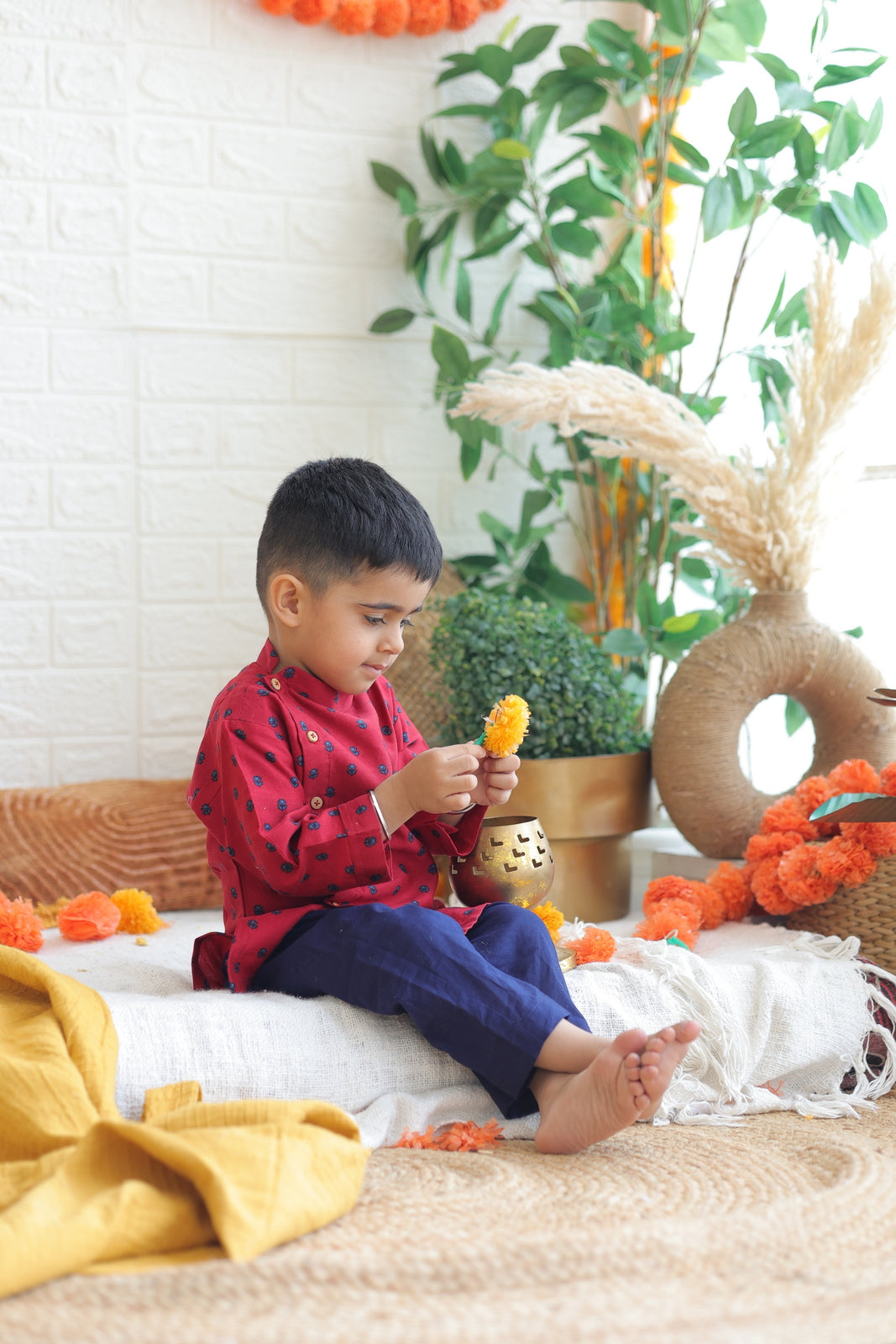 Make your little one the center of attention in our Dapper Motif Man outfit – a rich red and blue Bandhgala kurta set crafted for festive finesse.