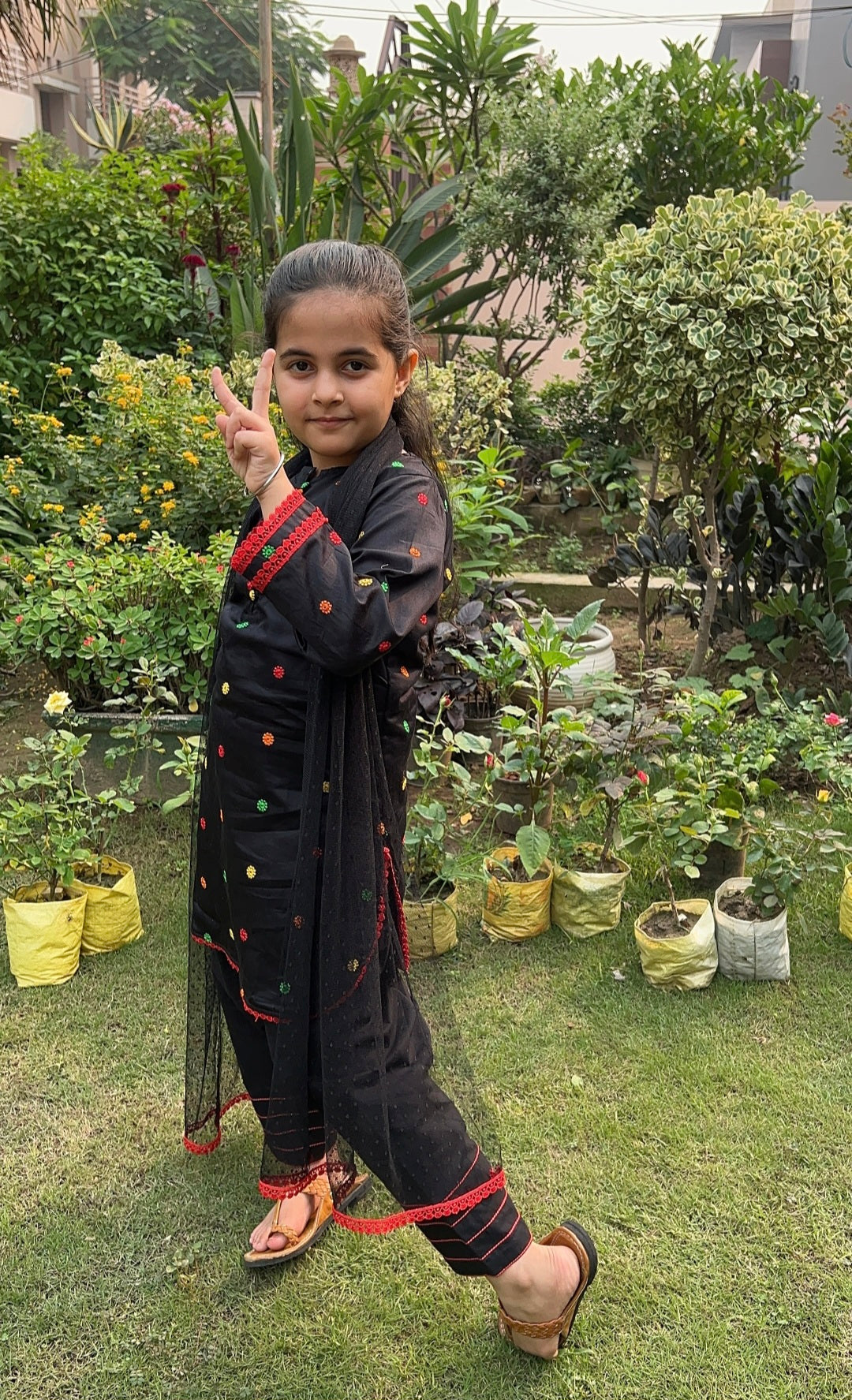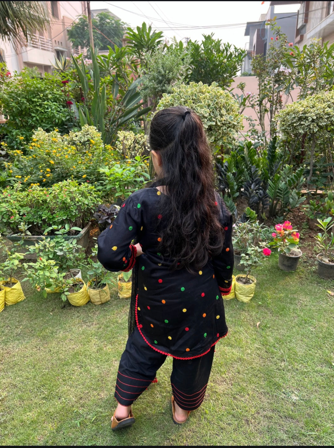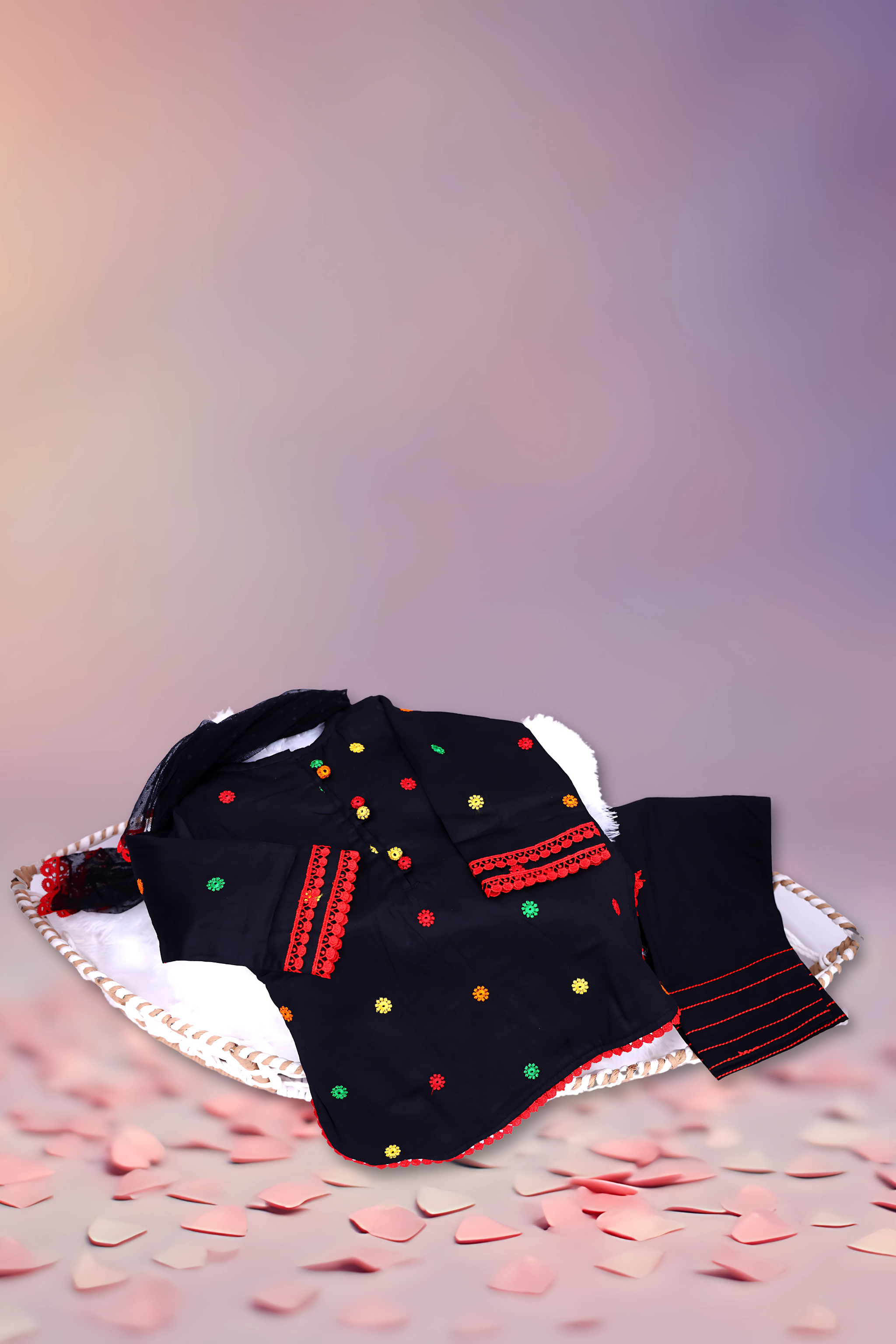 Add a vibrant twist to tradition with The Rang-e-Noor Suit, a black multi-colour cotton set adorned with delicate details. The kurta features red lace accents on the sleeves and hem, multicolour buttons at the front, and a comfortable back zip. The pre-washed cotton lining ensures all-day ease, while intricate threadwork adds a refined charm to the bottom. The set is completed with a soft net dupatta edged in matching red lace.