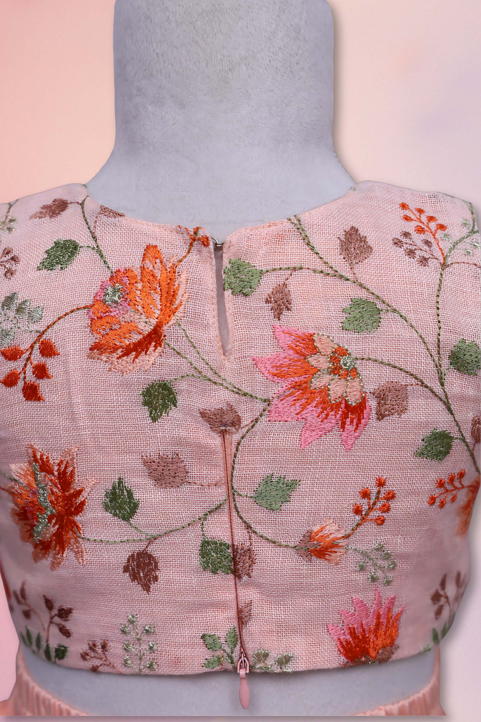 Elegant, dreamy, and full of charm — our Rosy Ruffle Charm lehenga set is made for those twirl-worthy moments. Featuring an embroidered linen blouse, a soft cotton lehenga with delicate frill detailing, and a matching peachy net dupatta, this set balances comfort and festive glam effortlessly.