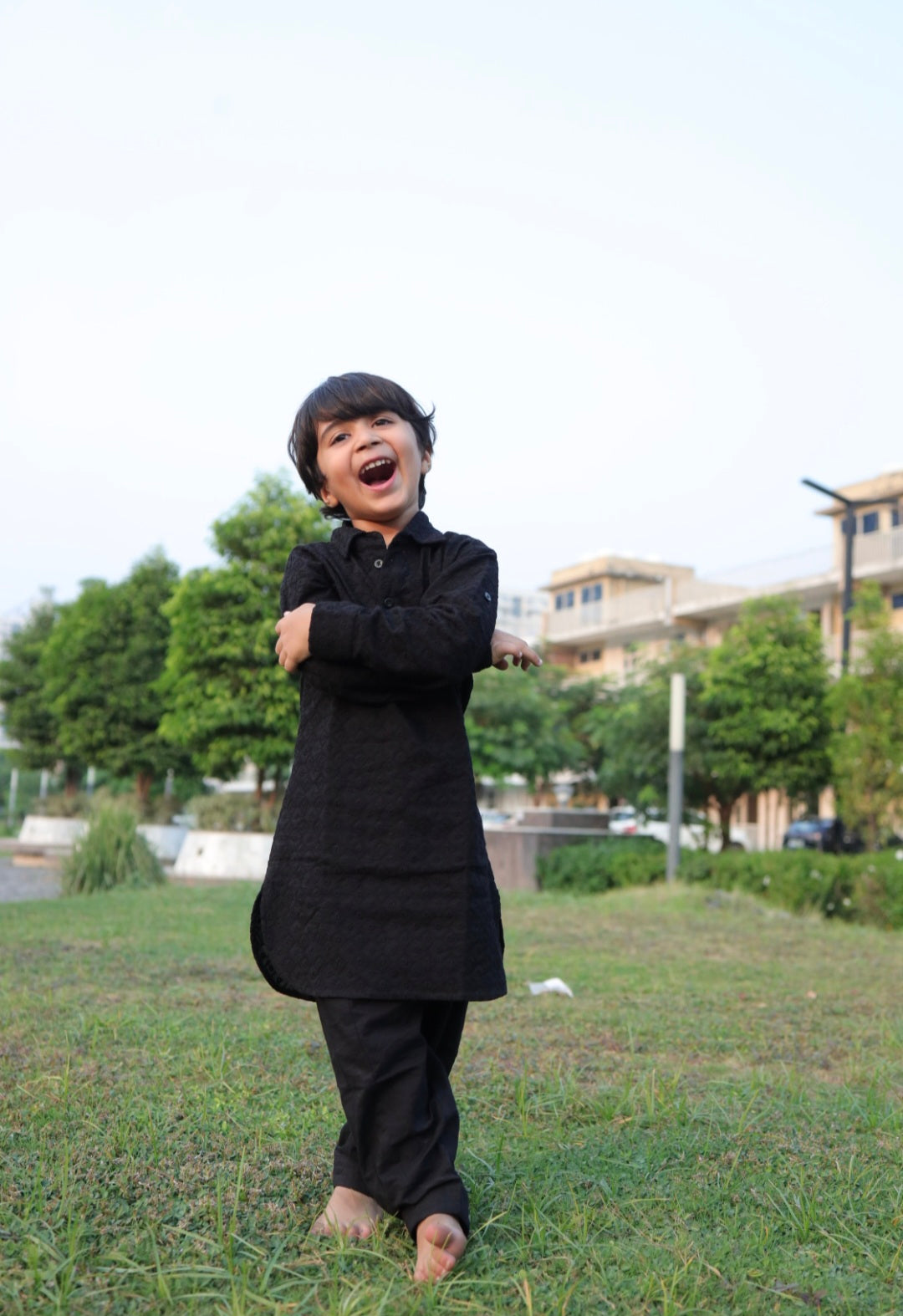 Classic elegance meets royal charm in The Sultan’s Charm Pathani, a jet-black cotton ensemble perfect for festive occasions and celebrations. The kurta boasts a straight-cut pathani silhouette with a collar and traditional side slits, paired with matching black pathani salwar for an effortlessly dashing look. Crafted from soft cotton, it promises unmatched comfort for your little prince.