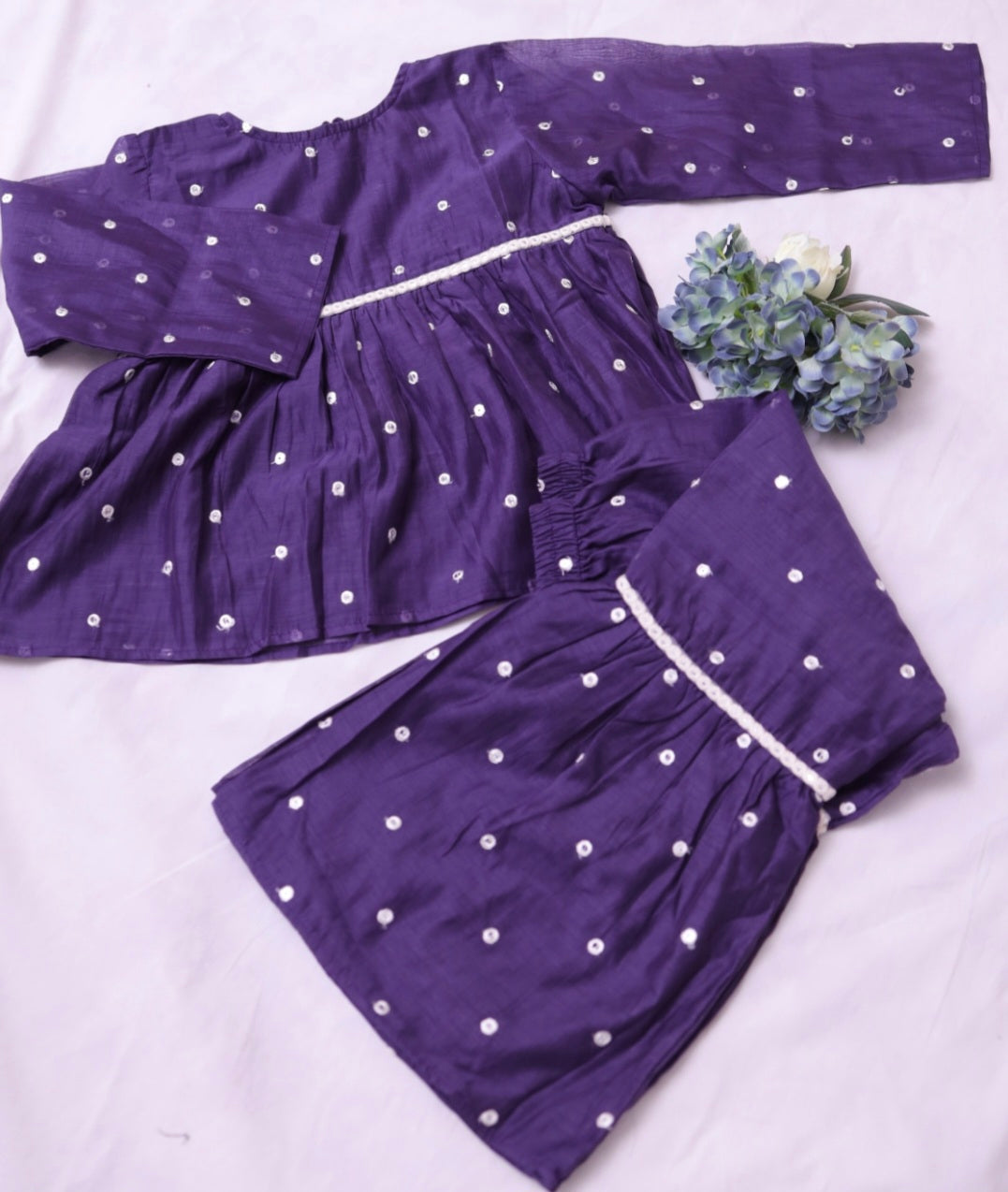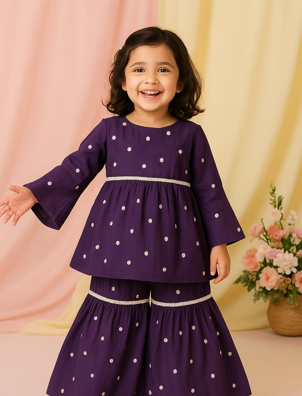 A charming purple-colored sharara set crafted in soft mul chanderi with delicate embroidery all over. The outfit is finished with a contrast ivory lace at the waist and sharara, adding a playful touch. Designed with a prewashed cotton lining for extra comfort, has a back zip, it’s lightweight, breathable, and perfect for festive occasions while keeping little ones happy and at ease.